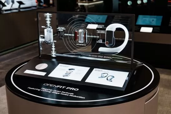 在CES展台,韶音特别围绕OpenFit Pro打造了沉浸式视听互动体验区,通过环幕投影,模拟办公、健身、咖啡厅、城市街头等多场景。参观者可亲身佩戴OpenFit Pro,直观感受其在各场景下的滤噪效果与音质表现,沉浸式理解“开放式滤噪”带来的体验革新。